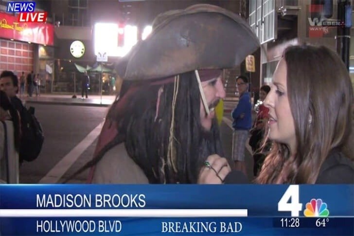 Karayip Korsanları’ndaki Kaptan Jack Sparrow’un videosu viral oldu. Jess Weber, Hollywood Bulvarı’ndaki Breaking Bad galası sırasında NBC 4 muhabiri Madison Brooks’un sözünü kesti.