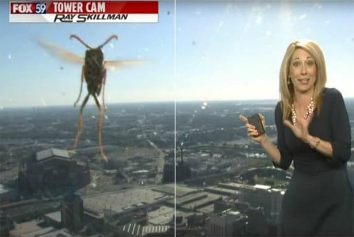 Fox 59 hava durumu spikeri Jennifer Ketchmark, Indianapolis’te güneşli bir günde canlı hava durumu tahmini sağladı. Kamera merceğinde dev bir arı belirerek gösteriyi kesintiye uğrattı. Ketchmark çığlık attı ve çerçeveden kayboldu.