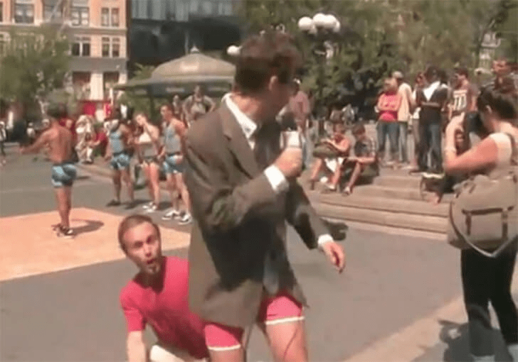 Olay Washington Meydanı’nda meydana geldi. Kim yaptı? Kamera önünde gazetecinin pantolonunu indirdiler. Gazeteci o kadar şok oldu ki şakacıyı takip edemedi. Kameraman kalabalığa karıştı ama artık çok geçti.