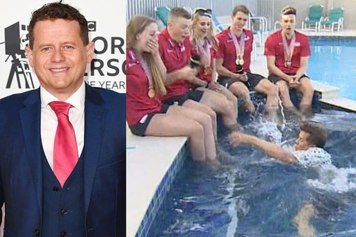 BBC spor sunucusu Mike Bushell, Adam Peaty’nin de aralarında bulunduğu birçok yüzücüyle röportaj yaptı. BBC muhabiri, adımlarına dikkat etmesi yönündeki uyarılara rağmen havuza düştü, ıslandı ve mikrofonuna zarar verdi. Vay!