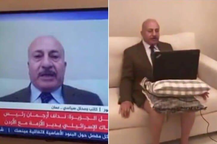 İş bluzları, günlük pantolonlarÜrdün gazetesi Al Rai Arabic’in eski genel yayın yönetmeni Majid Asfour, bir analistin nasıl görünmesi gerektiği konusundaki klişelere meydan okuyor. Al Jazeera ile yaptığı bir röportajda takım elbiseyle profesyonel görünüyordu. Ancak, tamamen giyinik olması gerekiyordu. Boğuk bir Skype röportajı sırasında, başka bir Twitter videosunda dizüstü bilgisayarını iki yastığa dayadığı görülüyor. Daha rahat kıyafetler tercih etti. Abu Dhabi Network, yaygın olarak paylaşılan videoyu yayınladı.
